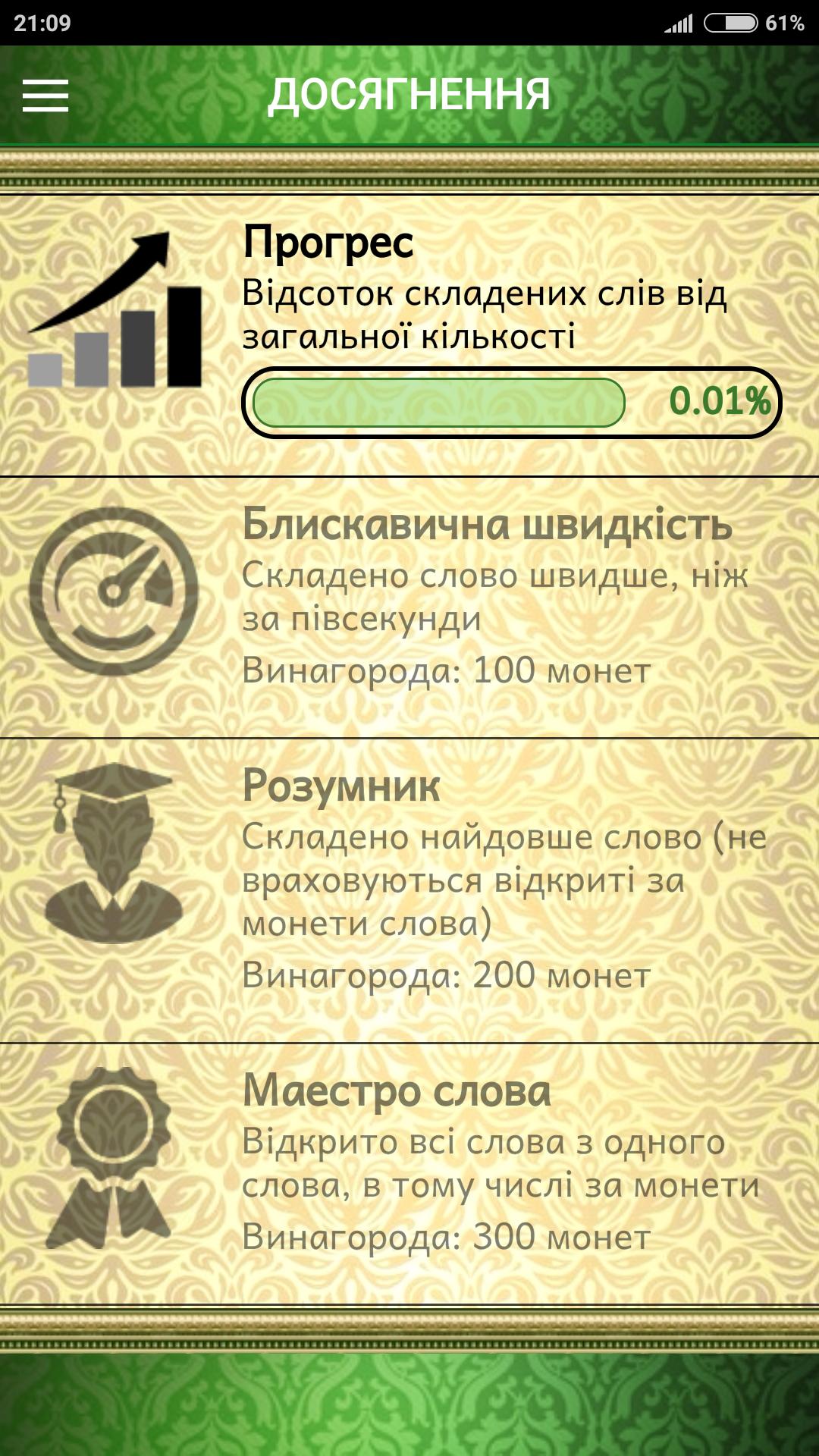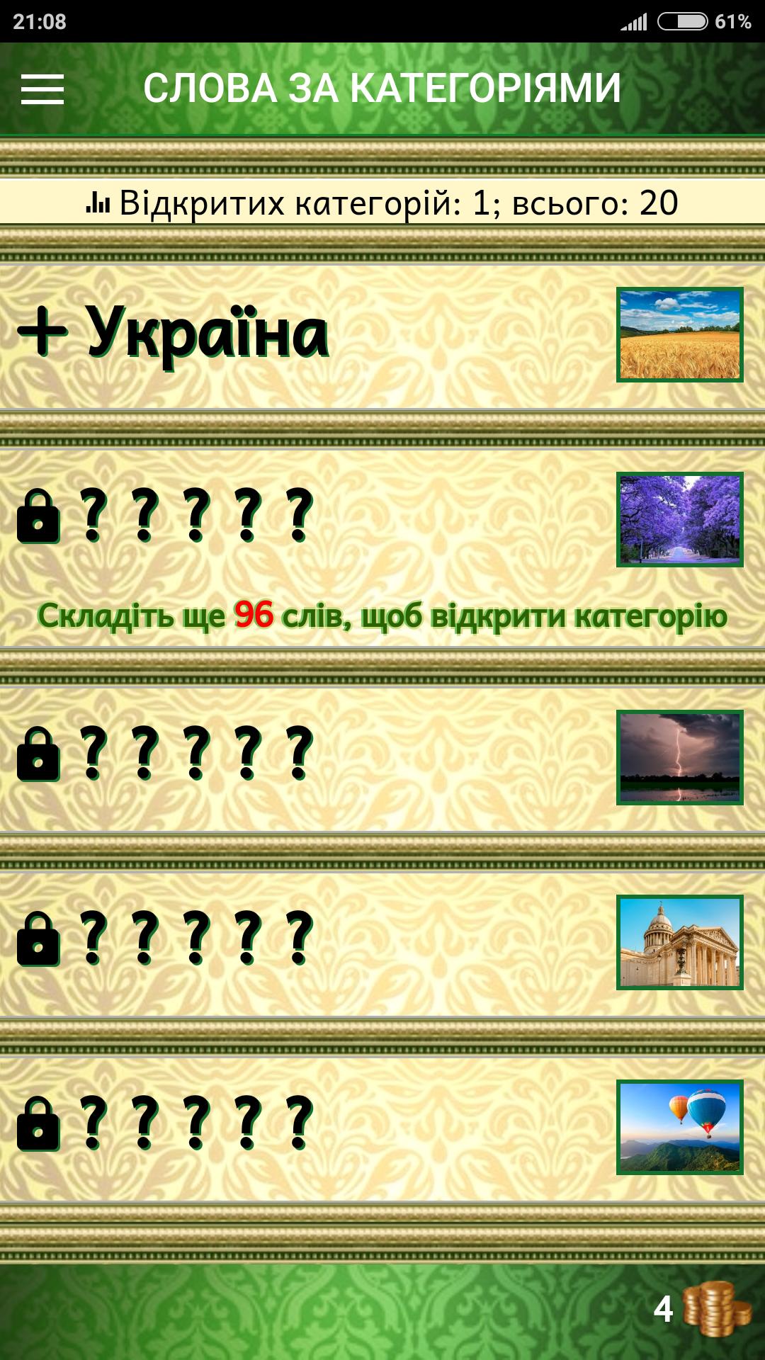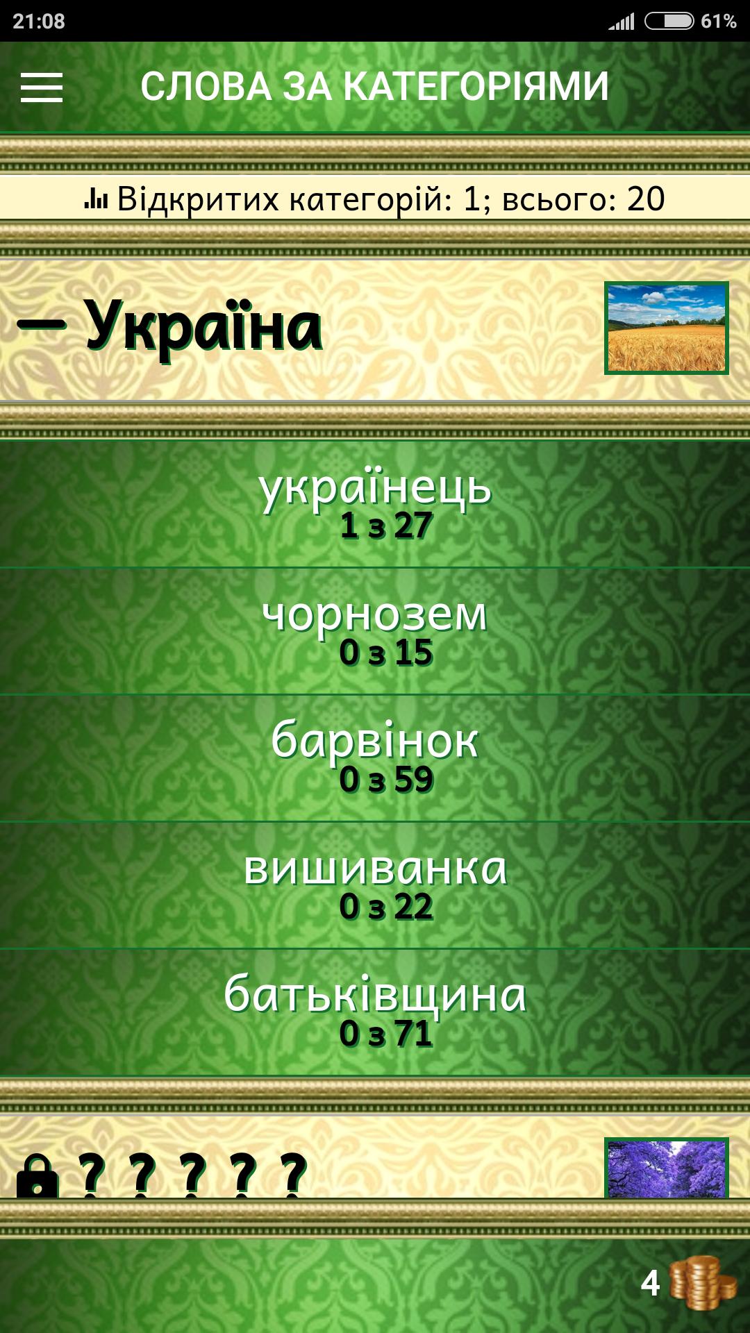 O jogo será interessante para quem gosta de jogos de palavras, palavras cruzadas ou aprende novas palavras. Você deve compor palavras de uma determinada tarefas de palavras que são combinadas em diferentes categorias por sujeito (por exemplo, "Ucrânia").